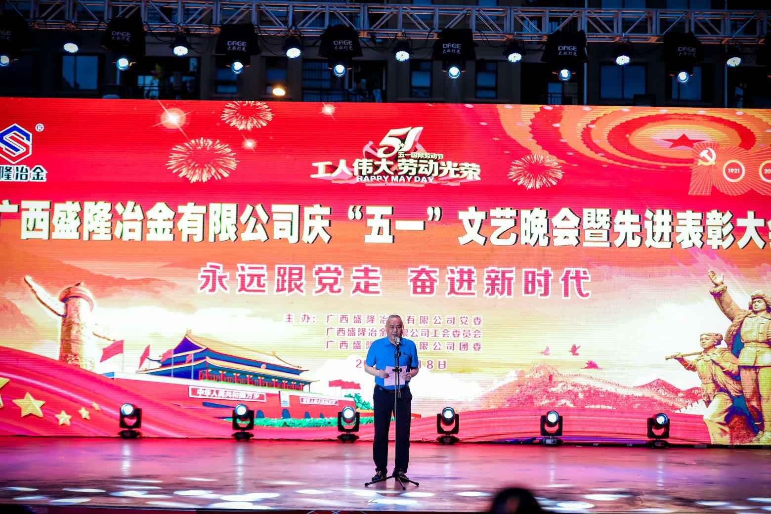5月8日晚,米兰官方端网站登录入口-米兰online(中国)盛隆佳园文化广场歌声嘹亮,掌声如潮。由米兰官方端网站登录入口-米兰online(中国)党委、工会委员会、团委联合主办的“永远跟党走,奋进新时代——庆‘五一’文艺晚会暨先进表彰大会”在这里隆重举行。公司常务副总经理陈亮出席晚会并致辞,副总经理兼安环总监吕华民、副总经理兼技术中心主任刘光穆、总工程师兼规划发展部经理梁新亮、总经理助理兼广西广盛高强耐磨新材料有限公司总经理王文凯、党委常务副书记游元喜、工会主席兼总经理办公室主任刘明奇及各厂部主要领导出席。